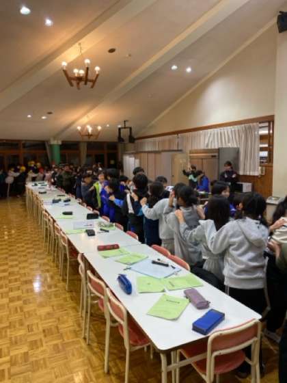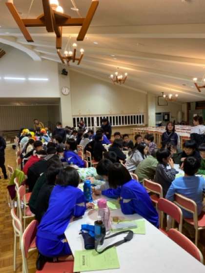 宿泊学習1日目の締めくくりは、学年レクリエーションです。活動係の企画した絵しりとりやクイズ、じゃんけん列車を楽しみました。