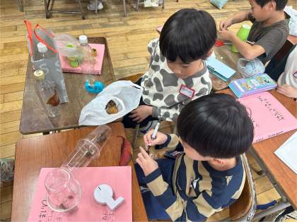 生活科の学習では、これまでに集めた秋の木の実や落ち葉を使っておもちゃや作品づくりを始めました。教科書を参考にしたり友達と相談したりしながら、楽しんで活動に取り組みました。