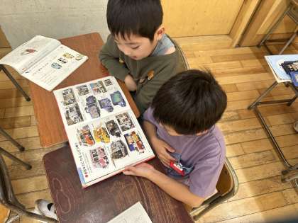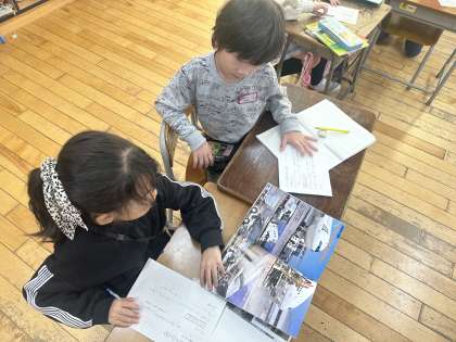 国語科の「じどう車ずかんを つくろう」の学習では、「じどう車くらべ」の学習を生かして、自分が選んだ「じどう車」の「しごと」と「つくり」を熱心に調べてプリントにまとめています。