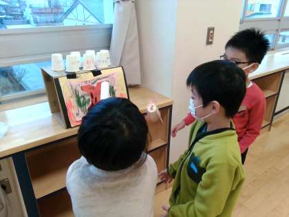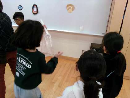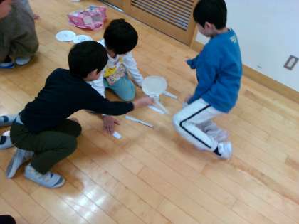 生活科では、作ったおもちゃで遊び合う「おもちゃ大会」の2回目をしました。それぞれのおもちゃに合った遊び方を工夫し、楽しい「おもちゃ大会」となりました。