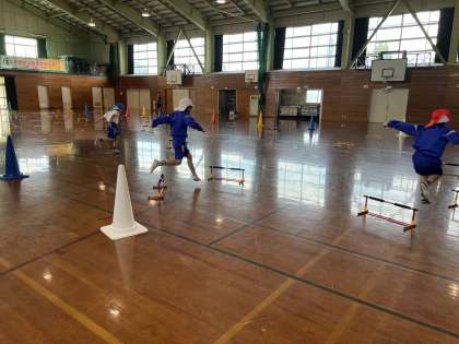 体育科では、自分たちでコースを作り、走って跳び越すハードルリレーをしました。どんなコースにしたら速く走れるか、相談しながらコース作りに取り組みました。