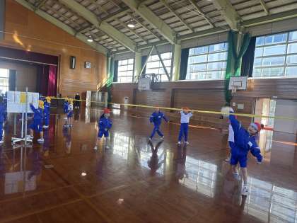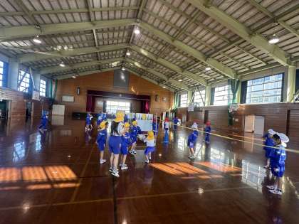 体育科「ゲット!ながれぼしゲーム」の学習では、同じ団の友達と作戦を考えながらゲームを行っています。ボールを扱うことに慣れてきた子供たちは、「人と人との間に投げたら点数が取れるよ」と投げる場所を工夫するなど、作戦をレベルアップさせています。