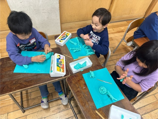 図画工作科の学習では、冬休みの思い出を粘土で表現しました。「初詣に行ってきたよ」「おじいちゃの家で家族みんなで遊んだよ」等、ペアと思い出を語り合いながら作品づくりに取り組みました。
