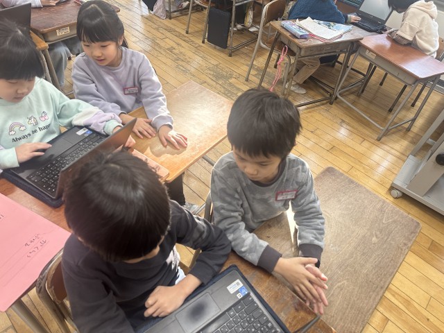 今日の生活科の学習では、新1年生の体験学習に向けて、「クロームブック体験チーム」と「ペアさんと学習チーム」がペアになって、時間配分を考えながら、1年生の学習を紹介したり体験したりする練習を行いました。