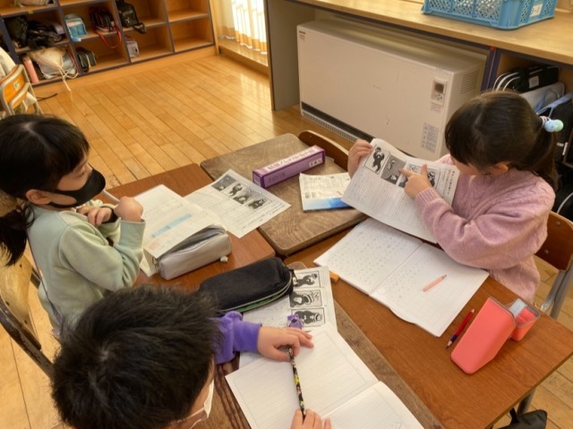 国語科では、4枚の絵を自由に並べ替え、物語をつくりました。グループで紹介し合い、お互いの作品のおもしろいところをたくさん見つけている姿が見られました。