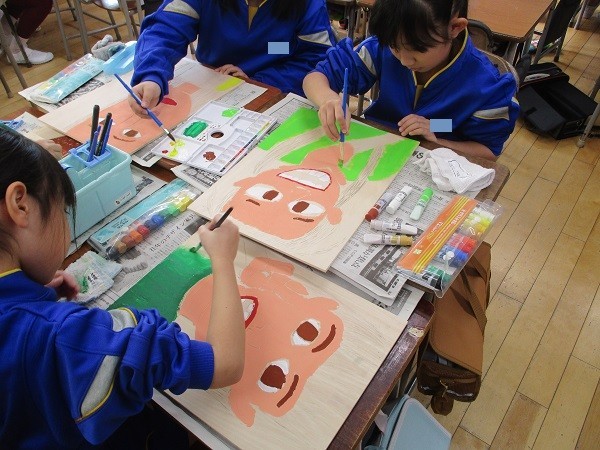 今日は版画板に絵の具で色を塗りました。自分の作品と向き合いながら、ていねいに筆を動かす子供たちの様子が見られました。