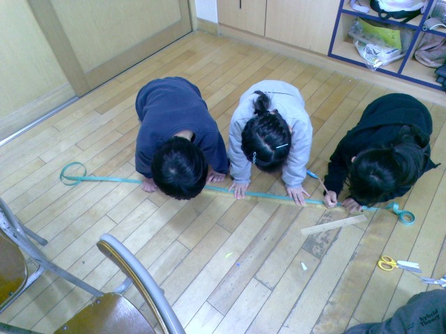 算数科の「長いものの長さの単位」の学習では、1mのものさしで測れない長さのものを、手作りのテープものさしを使って調べました。長さを予想したうえで実際に測定し、上手に長いものの長さを測ることができました。