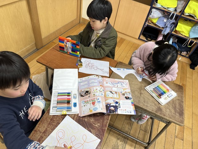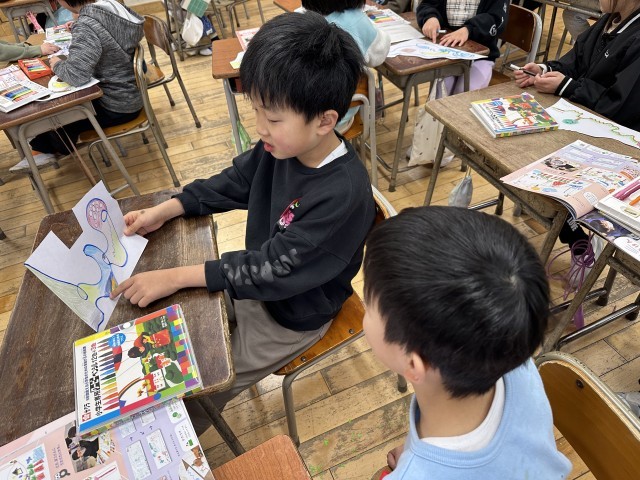 図画工作科の「せんのぼうけん」の学習では、 「この線はとがっているから山に見えるよ」「丸がつながっている線は車の形に見えるから、車でドライブをするお話にしようかな」等、線から想像を膨らませて描きました。