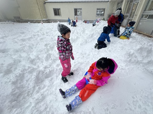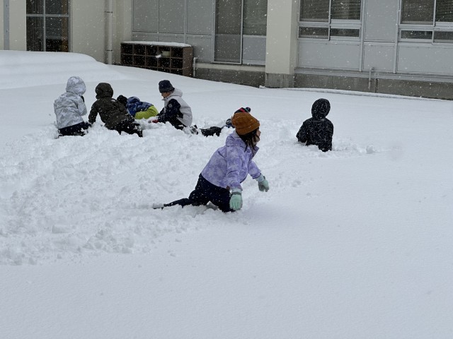 生活科の学習で雪遊びを行いました。たくさん積もった雪のおかげで、先週はできなかったそり遊びやかまくらづくりを楽しむことができました。