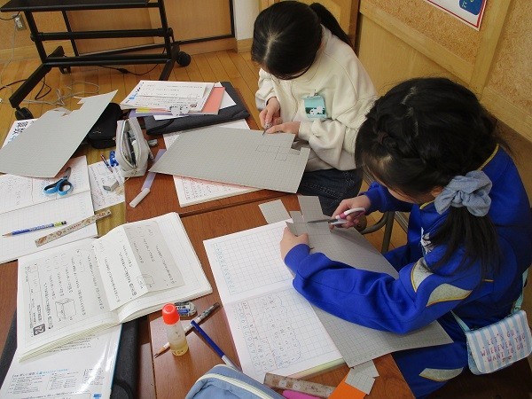 算数科「箱の特ちょうを調べよう」では、直方体や立方体の特徴について学習しています。今日はそれらの特徴を調べるために展開図をかき、直方体、立方体を作りました。箱を開くとどのような形になるのかをイメージすることに苦戦しながらも、仲間と協力し箱を作ることができました。