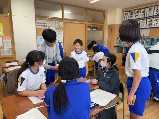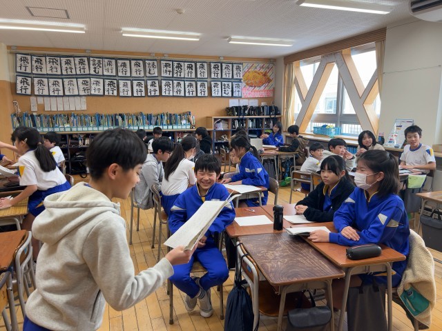 国語科の「もう一つの物語」の学習では、元の物語を書き変えてつくったお話を友達に紹介しました。内容のおもしろさを味わったり、構成や読み方の工夫を伝え合ったりして、友達のがんばりにたくさん気付いていました。