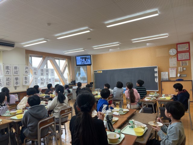 卒業お祝い週間の給食時間は、放送チームが用意した「6年生の思い出放送」のテレビ放送を行っています。今日は、6年生が4年生の頃の思い出を紹介しました。他の学年の子供たちが「自分たちと同じ学習をしていたのだな」「楽しそう」等と、楽しく聴く様子が見られました。