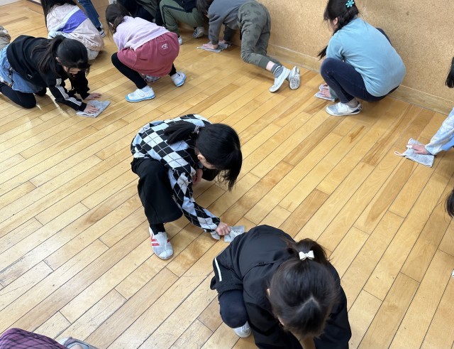 床に付いた鉛筆の跡を丁寧に水拭きしたり、埃が残らないように隅々まで乾拭きしたりと、熱心に清掃に取り組みました。
