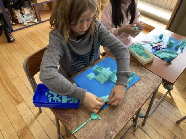 図画工作科では、「ねん土マイタウン」の学習をしています。粘土をいろいろな形に変えて、自分の思いうかべた町を表現しました。