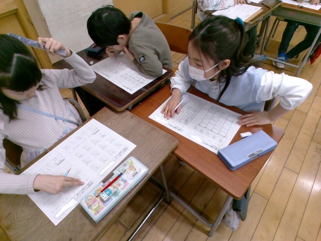 算数の学習では、2年生の振り返りとして筆算の学習をしました。分からないことをペアに聴くなど、助け合いながら真剣に取り組む子供たちでした。