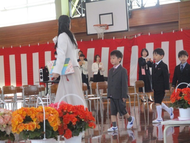 真新しいランドセルを背負って登校してきた子供たちは、少し緊張した表情で式に臨んでいましたが、担任が読み上げる自分の名前に、元気な声で返事をしていました。