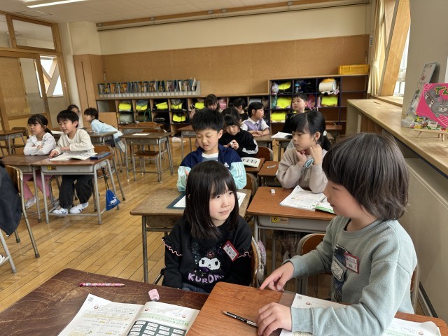 算数科の「わかりやすくあらわそう」の学習では、実際にグラフや表にまとめる活動を行いながら、ペアでグラフや表のよさを聴き合いました。