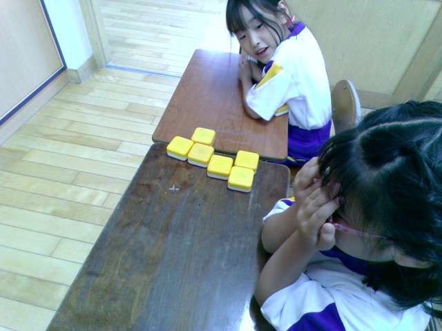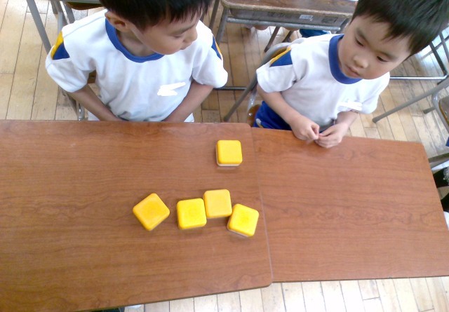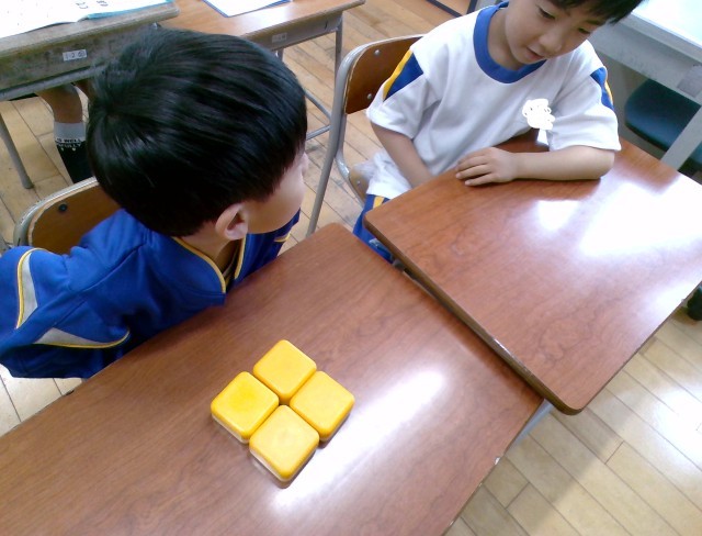 算数科では「いくつといくつ」との学習をしています。ブロックを使って問題を出し合ったり、教え合ったりして、できる「わくわく」を増やしている子供たちです。