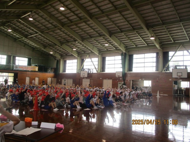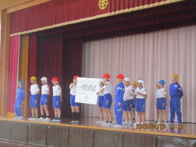 集会の後は、結団式も行いました。団役員の思いを聴いたり、団結エールを一緒に行ったりする奥田っ子の姿を見て、6年生は、「運動会を成功させたい」という思いを強くしました。
