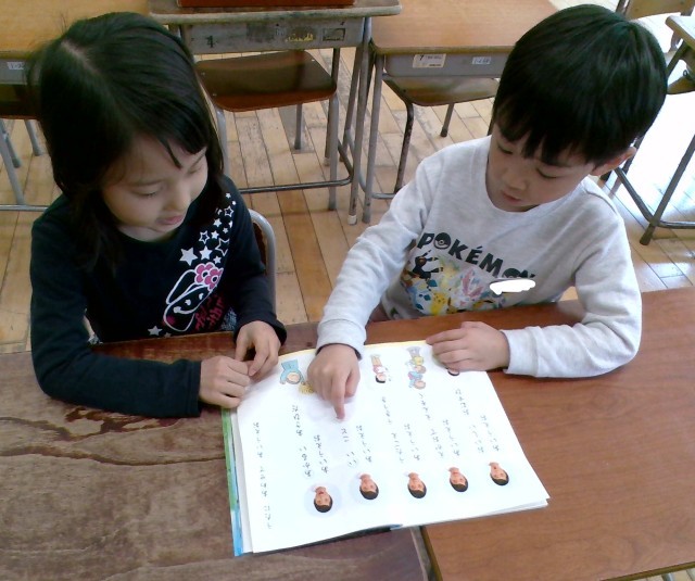国語科「うたにあわせてあいうえお」の学習では、口を正しい形に開けているか、ペアさんと確かめながら音読しています。