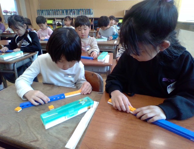 「いくつといくつ」の学習では、ブロックを使いながらペアの友達と問題を出し合う活動を行いました。