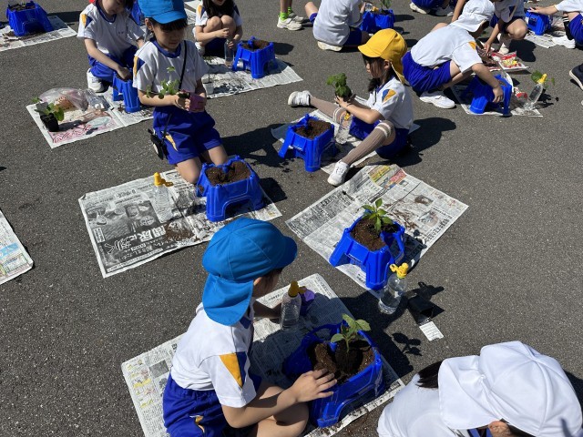 生活科の学習では、自分で育てる野菜の苗植えを行いました。
