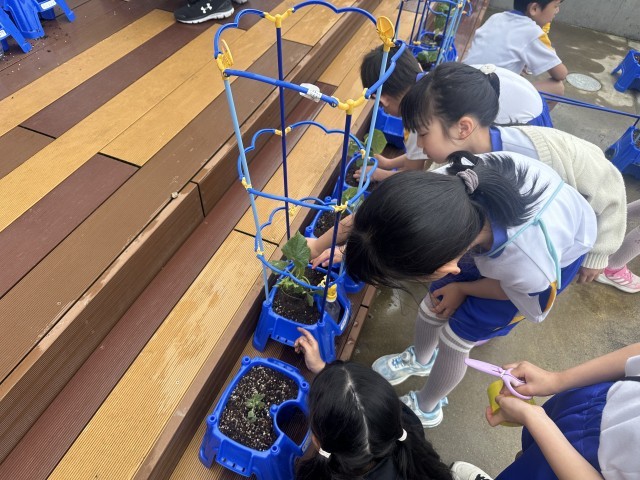 そこで生活科の学習では、それぞれが困っていることやその解決方法を聴き合い、支柱を立てたり紐で苗を倒れないように固定したりしました。