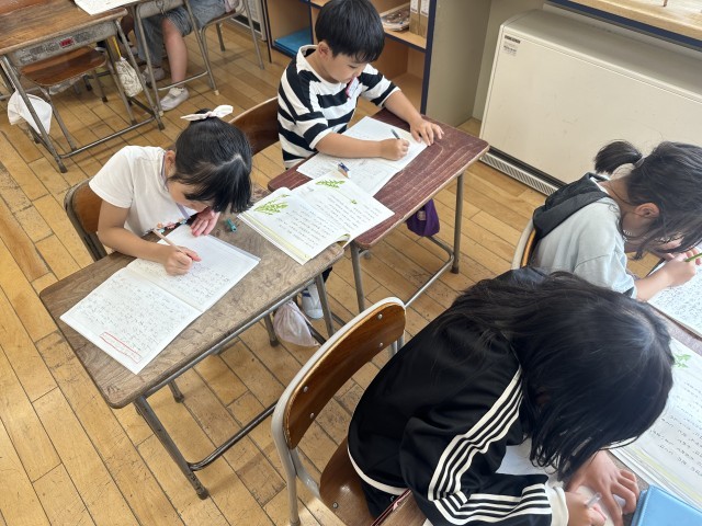 2年生になって初めての説明文でしたが、「文と絵をつなげて想像するんだったよね。」「言葉に注目しながら音読して、たくさんたんぽぽの知恵を見つけたいな。」など、ペアさんとこれからの学習で頑張ることを伝え合い、ノートにまとめました。