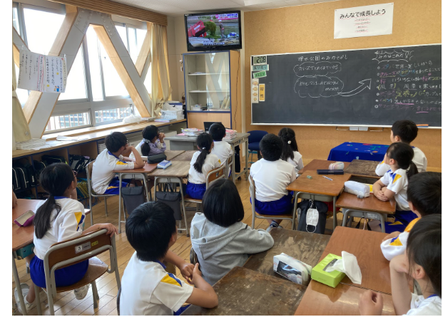 総合的な学習の時間では、環水公園の魅力をグループで聴き合い、今の環水公園の様子についての動画を見ました。環水公園の環境の問題に驚く子供たちでした。