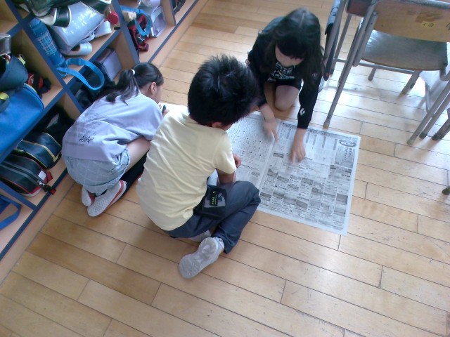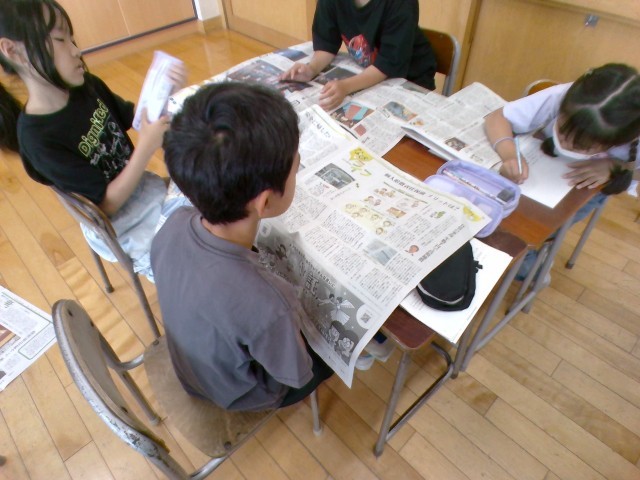 国語科「新聞を作ろう」の学習では、校外学習の新聞を作ります。今日は、普段見ている新聞にどのような工夫があるか見付け、グループで聴き合いました。