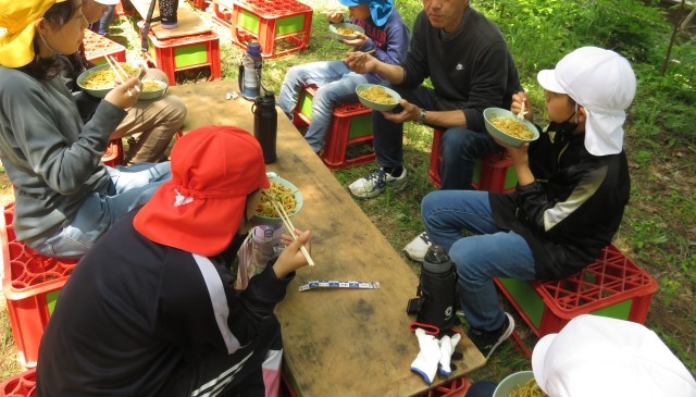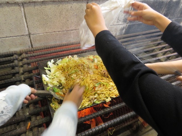 野外炊飯では、焼きそばを作りました。班の仲間と協力し、おいしい焼きそばをつくることができました。