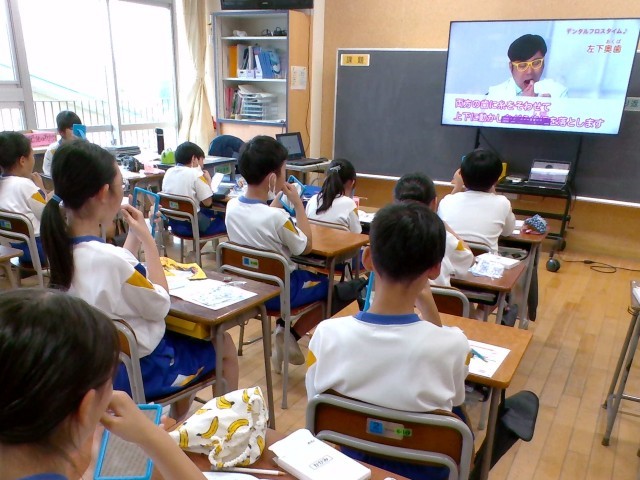 5年生は、全国小学生歯みがき大会に参加しました。動画を見ながら、デンタルフロスや歯ブラシの正しい使い方を学びました。日頃から行っている歯みがきを見直すよい機会となり、より丁寧に歯を磨こうという気持ちを高めていました。