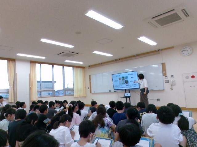 総合的な学習の時間には、食と自分たちの関わりについて考えています。今日は栄養教諭から、給食に使われている食材や献立の工夫について話を聞きました。給食の秘密を知り、食と自分たちの関わりについてより関心を高めました。