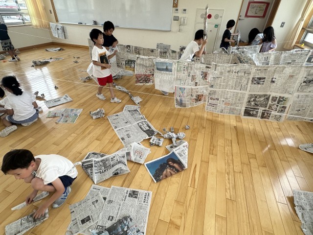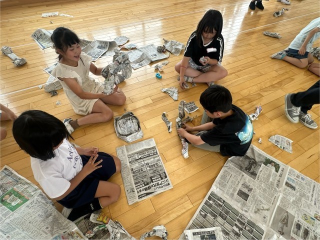 図画工作科の「しんぶんしとなかよし」の学習では、新聞紙を使って帽子や生き物を作ったり、1枚ずつ丁寧に吊るして並べたりする活動を楽しみました。
