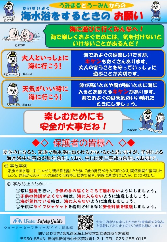 第9管区海上保安本部より、若年者の遊泳中の事故防止の一環としてリーフレットが届きました。