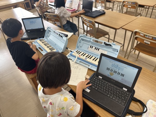 音楽科の「ぷっかりくじら」の学習では、クロームブックや鍵盤ハーモニカを使って旋律づくりを行いました。