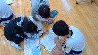 国語科「カンジー博士の暗号解読」ではグループの仲間と記号に入る音を予想し、音に...
