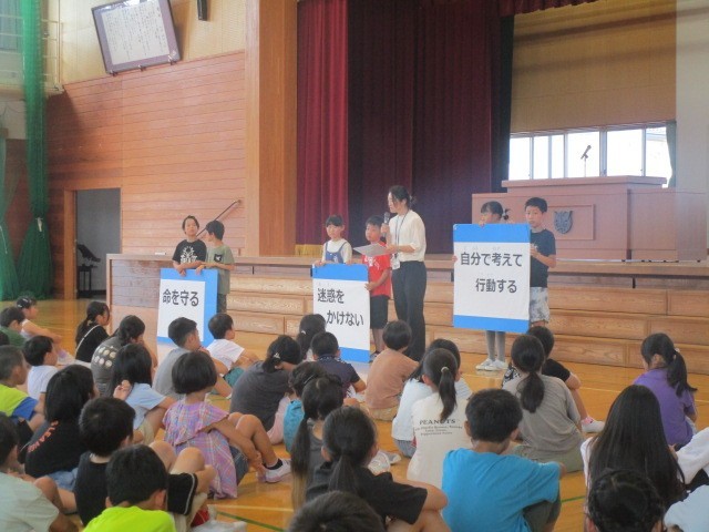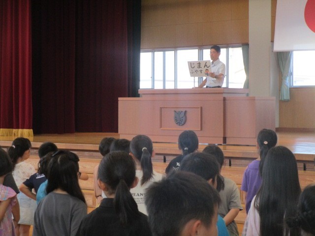 1学期の終業式があり、校長先生から「自慢をふやす」「仲間を大切に」「元気に過ごす」の3つについて話がありました。