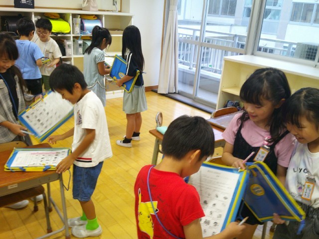 久しぶりの学校では、元気いっぱいの挨拶をしながら教室に入りました。夏休みの思い出を話すなどして楽しそうに過ごす姿がありました。学級活動では、「夏休みビンゴ」で楽しく交流する子供たちでした。