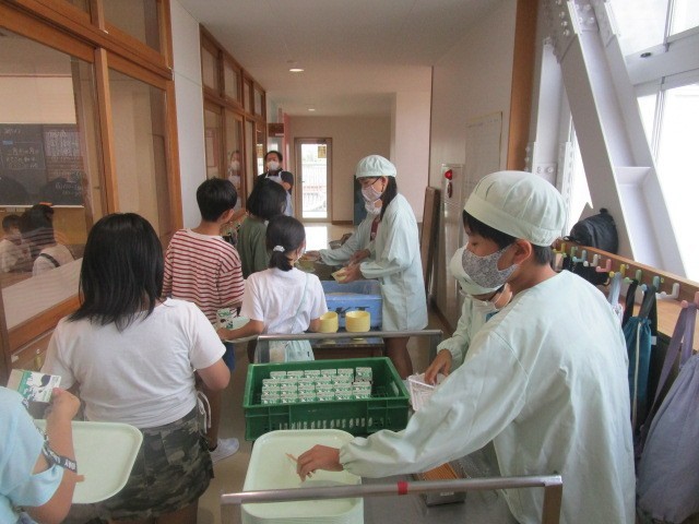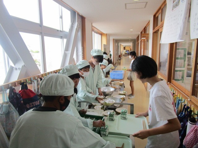 2学期の給食が始まり、当番の子供たちが準備をがんばっています。