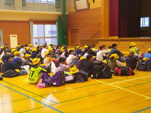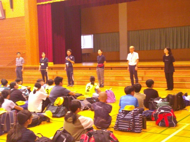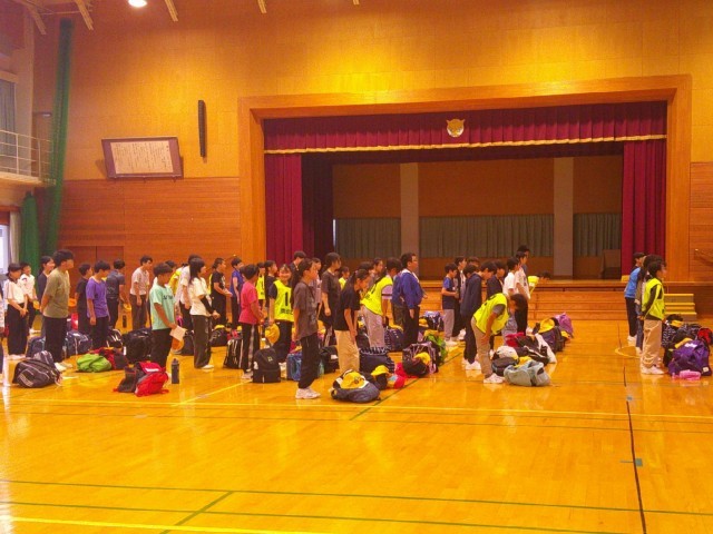 いよいよ集団宿泊学習の始まりです。体育館で出発式を行いました。