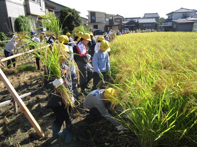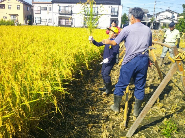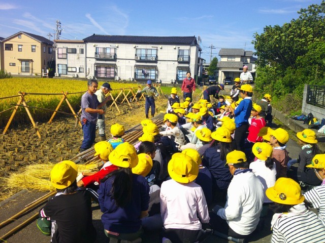 子供たちは稲刈りの仕方の説明を聞いた後、二人ペアになって、稲を刈る役と稲を束にして近くに置く役とに分かれて作業を行いました。