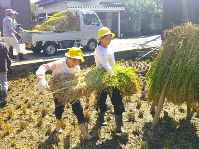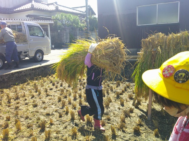最後に、田んぼの中には子供たちが収穫した稲がどっしり並んでおり、昔の人の手作業の大変さを実感することができました。