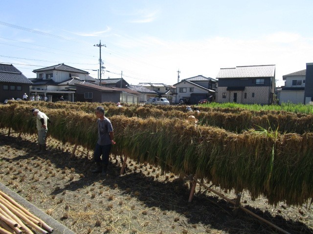 束にした稲をわらで縛り、次にはさがけをしていきました。