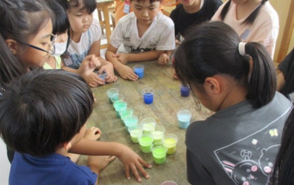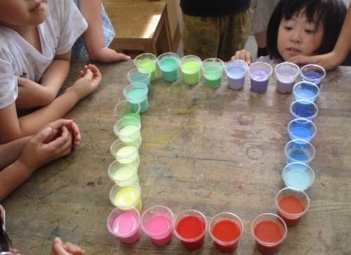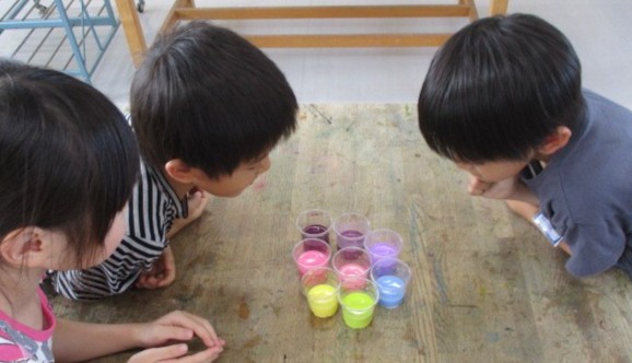 自分の好きな色の水をつくって、同じ班の友達で並べました。