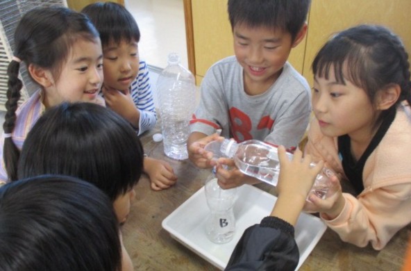 算数科「どちらがおおい」の学習で、2つのペットボトルのどちらが多く入るか、比べ方を考えました。
