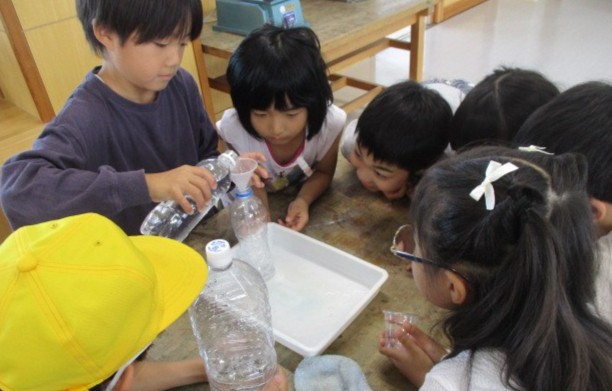 実際にペットボトルに水を入れて、比べっこして確かめました。協力し合って比べる姿が見られました。