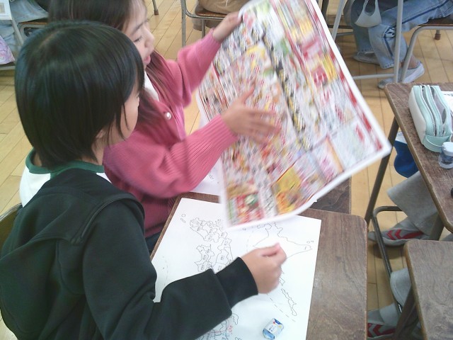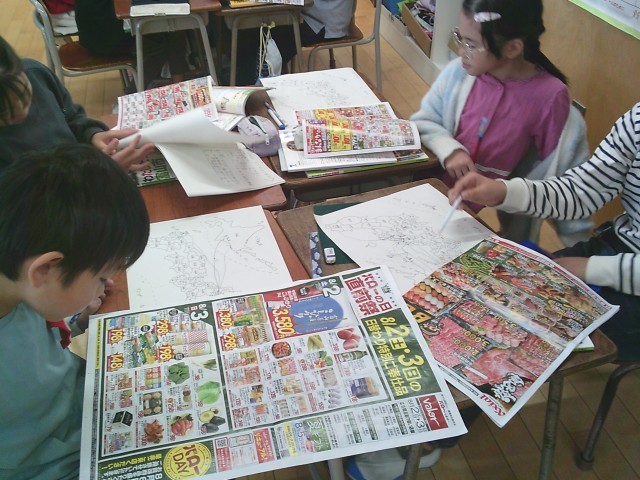 社会科「店ではたらく人」の学習では、スーパーマーケットの商品はどこから届くのかという課題から、実際のチラシを見て探しました。子供たちは「玉ねぎは北海道産と書いてあります!」「外国からも届いていました」と次々に見つけていました。さまざまなところから商品が届くことを知ることができました。