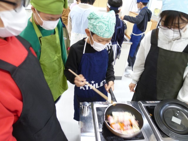 家庭科の時間に調理実習を行いました。人参やえのきをベーコンで巻き塩コショウをかけておいしく食べていました。どの班も上手にできたようです。