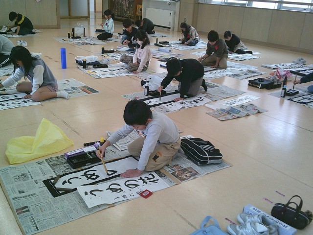 3年生から毛筆を使って学習しています。授業で習った「とめ」「はね」「はらい」を意識して体全体で書きました。校内書き初め大会に向けて、これからの上達が楽しみです。